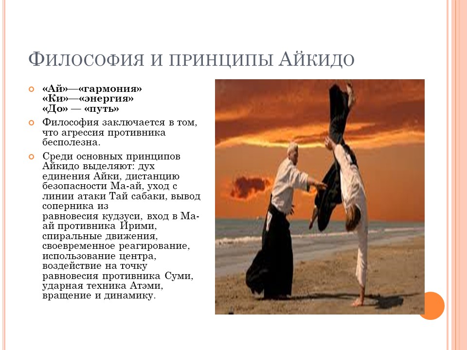 Айкидо — японское боевое искусство, разработанное Морихеем Уэсибой (часто его называют "О-Сенсэй" или "Великий учитель"). На физическом уровне это - искусство, включающее некоторые броски и захваты, заимствованные из Дзю-Дзюцу и некоторых бросков и других методов, производных из КенДзюцу. Айкидо фокусируется не на ударах ногами или руками противников, а скорее на использовании их собственной энергии для их контроля или броска далеко от Вас. Это - не статическое искусство, внимание акцентируется на движении и динамике перемещения. При более близком рассмотрении, занимающиеся найдут в Айкидо, то, что они ищут, будь то методы самозащиты, духовное просвещение, физическое здоровье или спокойствие духа. О-Сенсэй подчеркивал физические и духовные аспекты этого искусства, акцентируясь на проявлениях гармонии и мира.